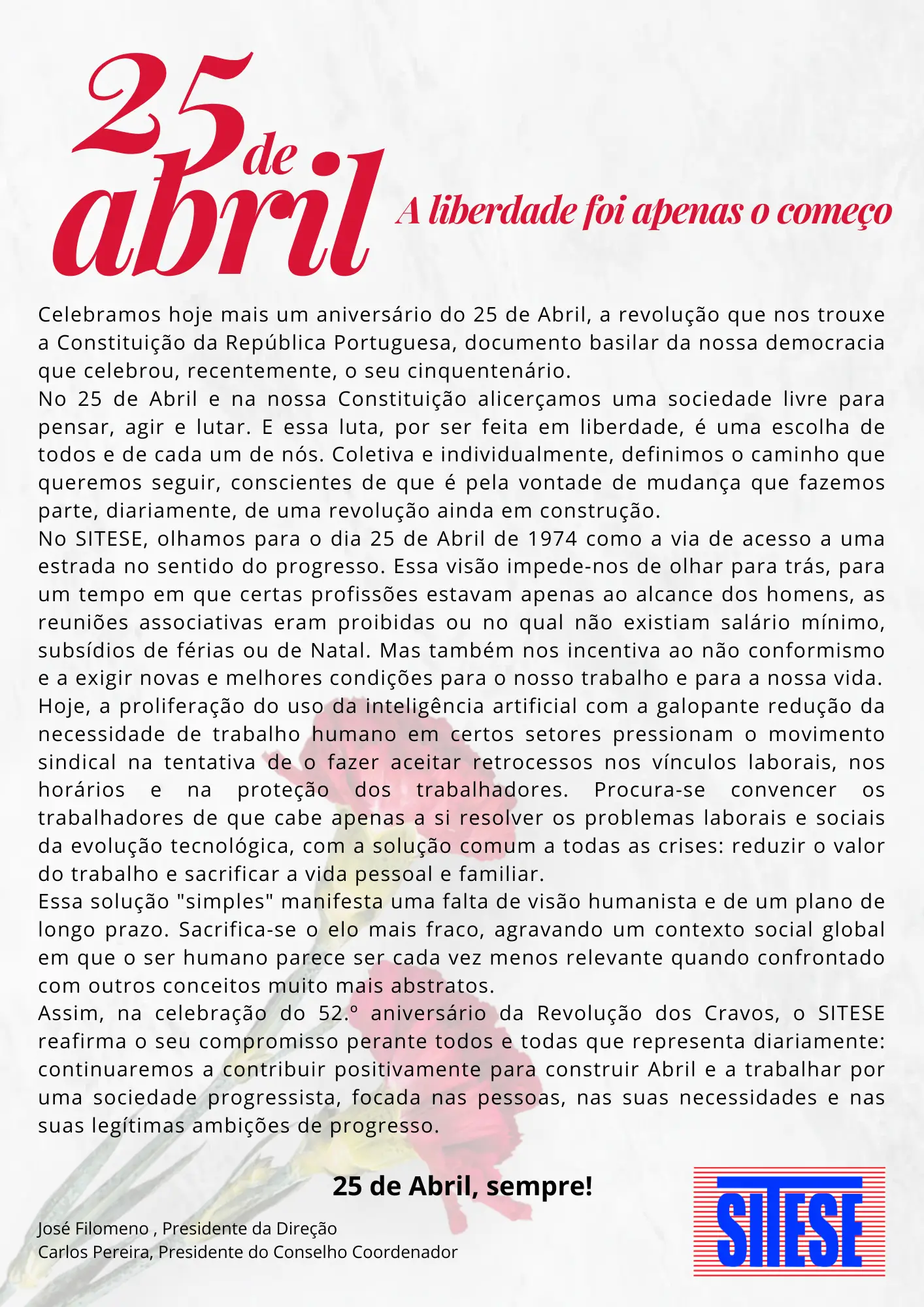 Assim, na celebração do 52.º aniversário da Revolução dos Cravos, o SITESE reafirma o seu compromisso perante todos e todas que representa diariamente: continuaremos a contribuir positivamente para construir Abril e a trabalhar por uma sociedade progressista, focada nas pessoas, nas suas necessidades e nas suas legítimas ambições de progresso.
